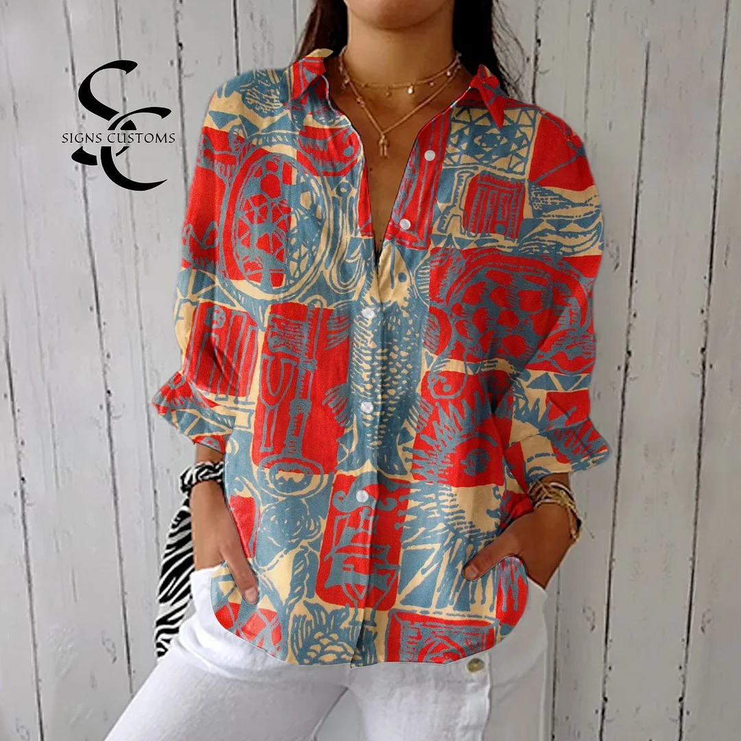 Women's Vintage Abstract Art Print Casual Linen V-neck Shirt