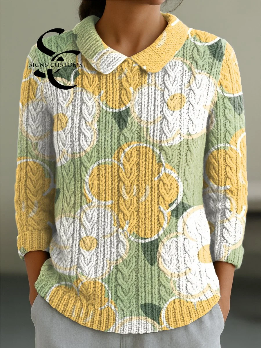 Women's Cute Large Flower Painting Art Print Casual Peter Pan Collar 3/4 Sleeve Sweater