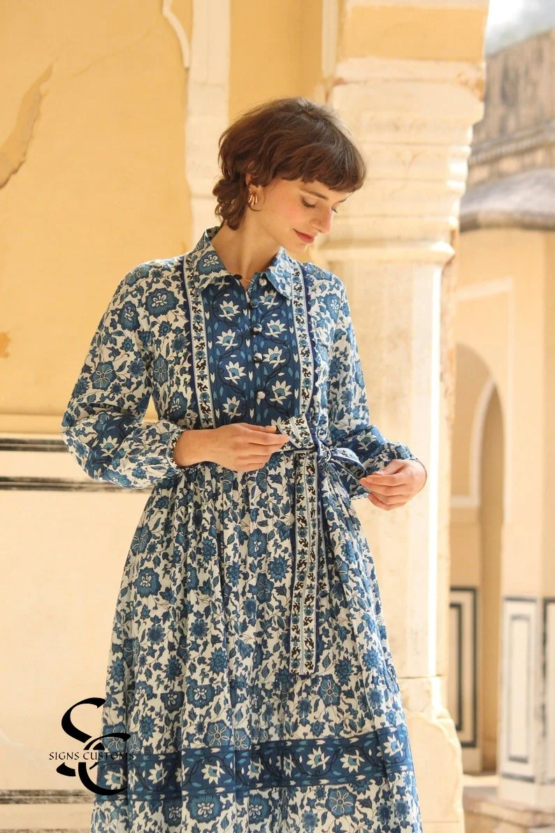 Crafted from 100% soft cotton with traditional hand block printing, this beautifully designed dress features a full lining for extra comfort and durability. Its breathable fabric and elegant style make it a perfect gift for your loved ones, ideal for both casual days and special occasions.