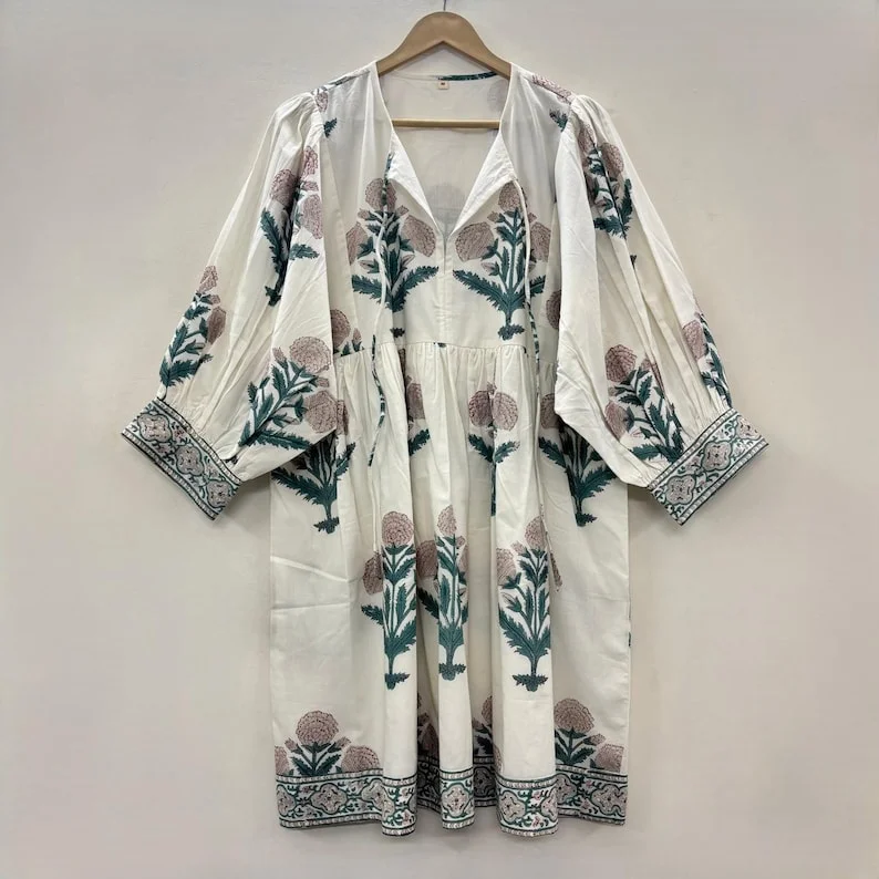 Crafted from 100% soft cotton with traditional hand block printing, this beautifully designed dress features a full lining for extra comfort and durability. Its breathable fabric and elegant style make it a perfect gift for your loved ones, ideal for both casual days and special occasions.