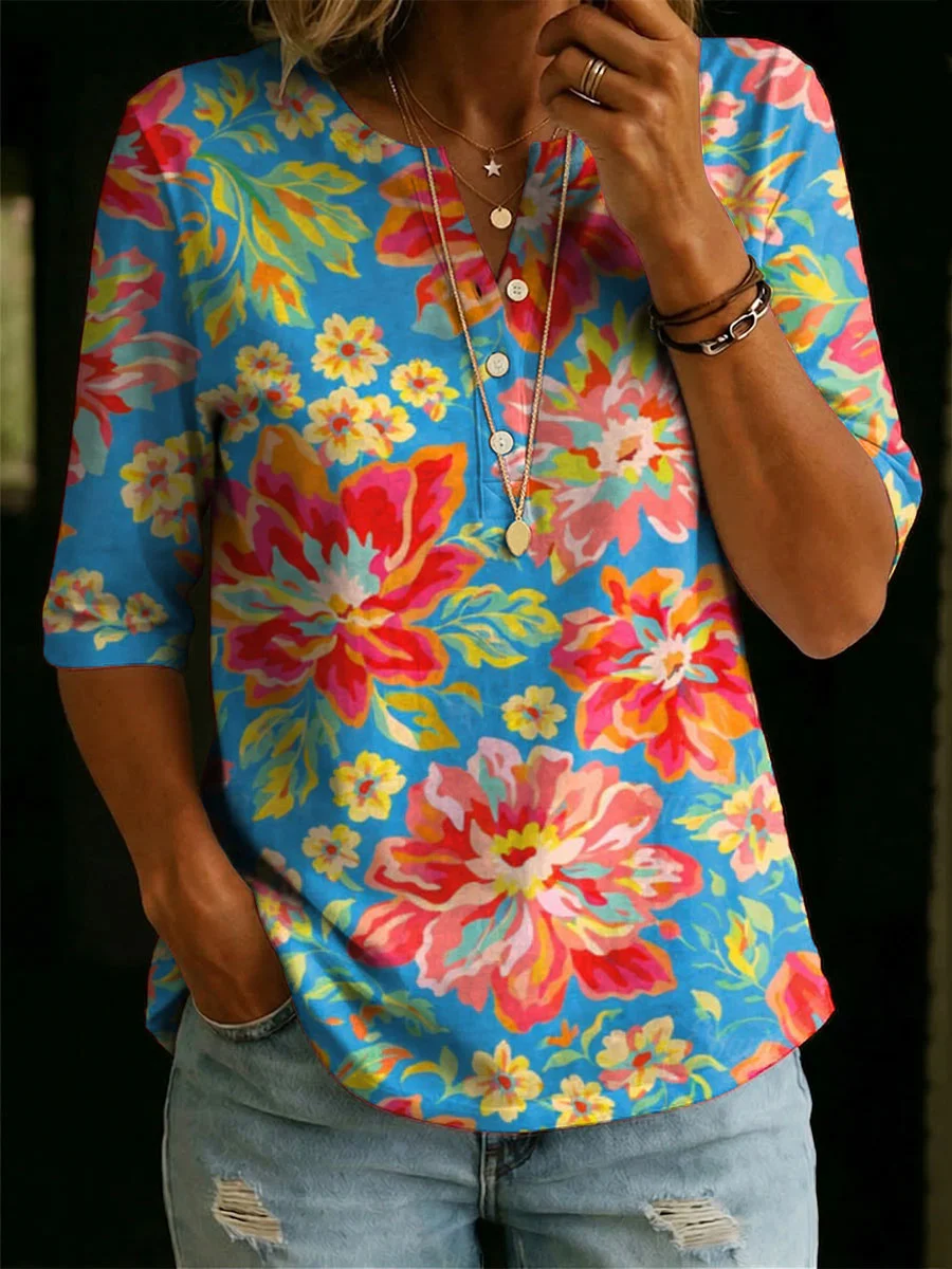 Women’s Floral Pattern Art Casual Classic Henley Collar 100% Cotton T-shirt