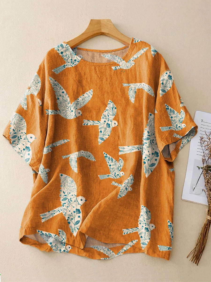 Women's Retro Abstract Pattern Peace Dove Art Print Casual Linen Crew Neck Shirt