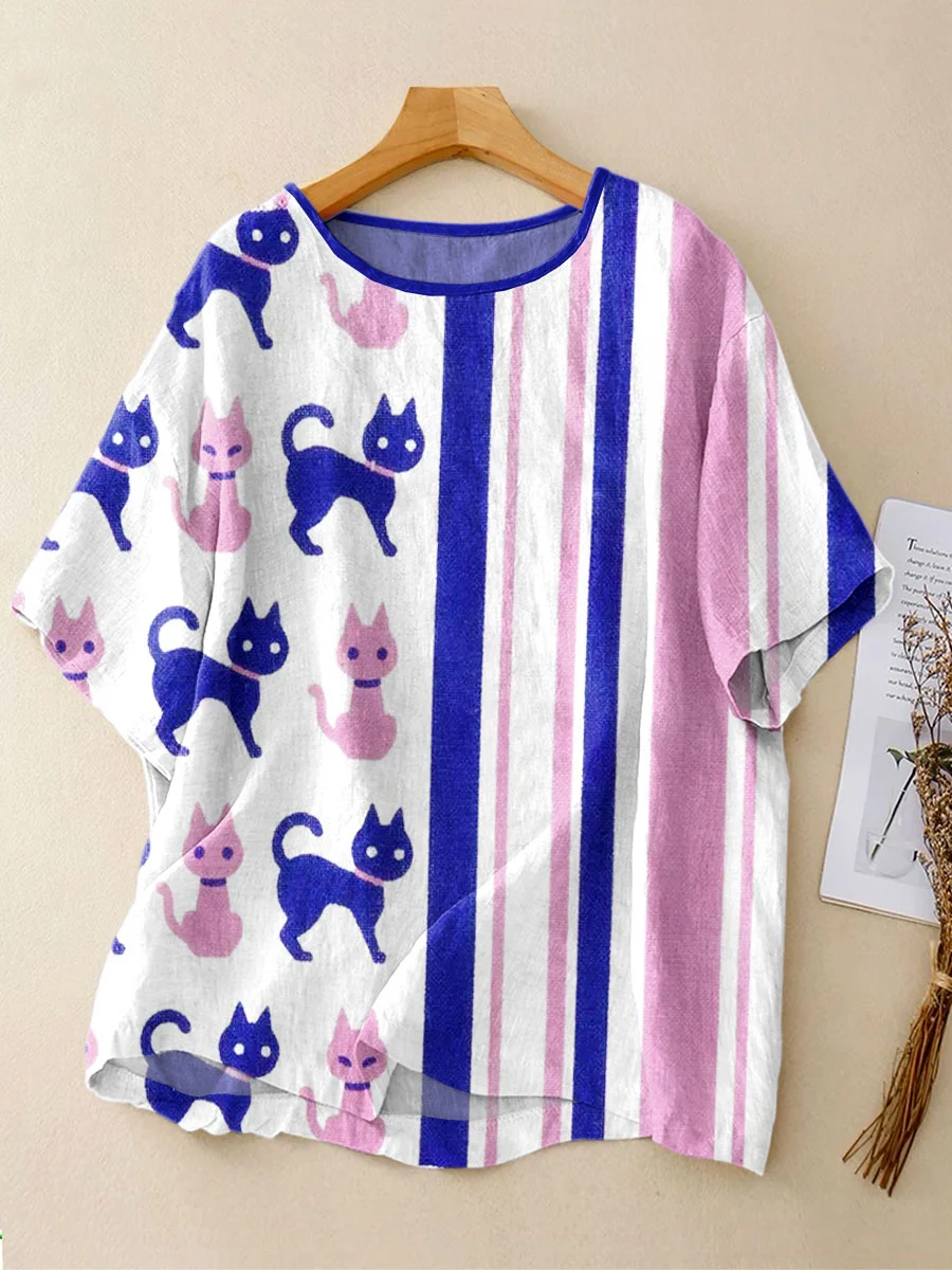 Women's Vintage Cat Line Art Print Casual Linen Crew Neck Shirt