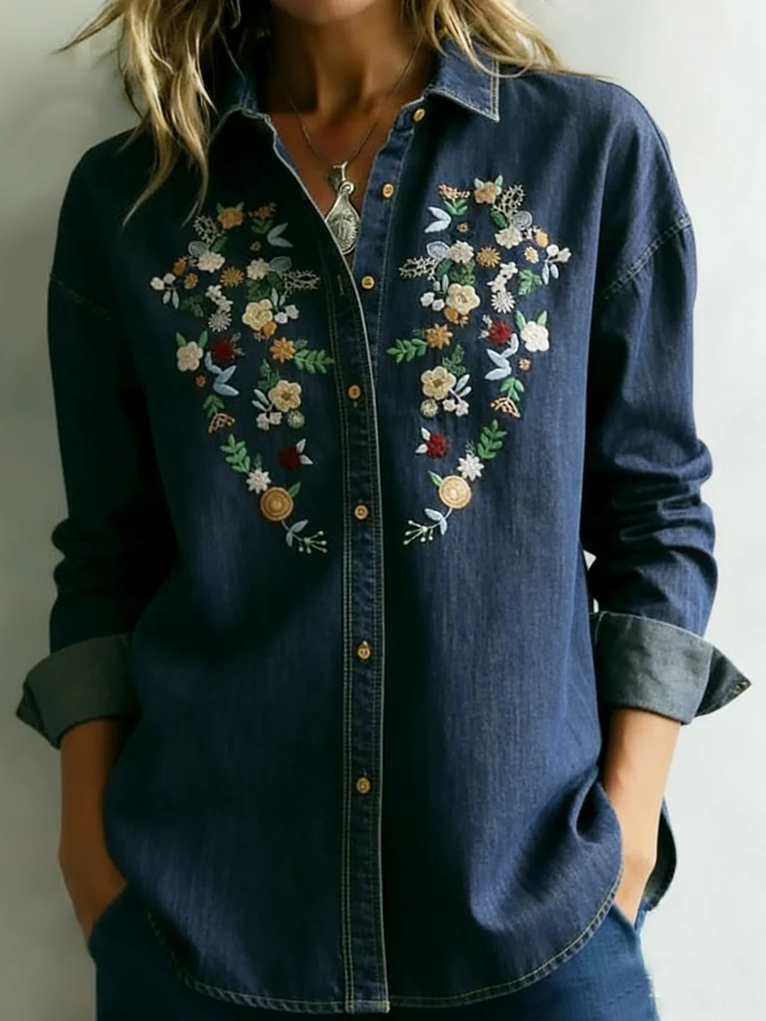 Love-filled Floral Embroidered Denim Shirt