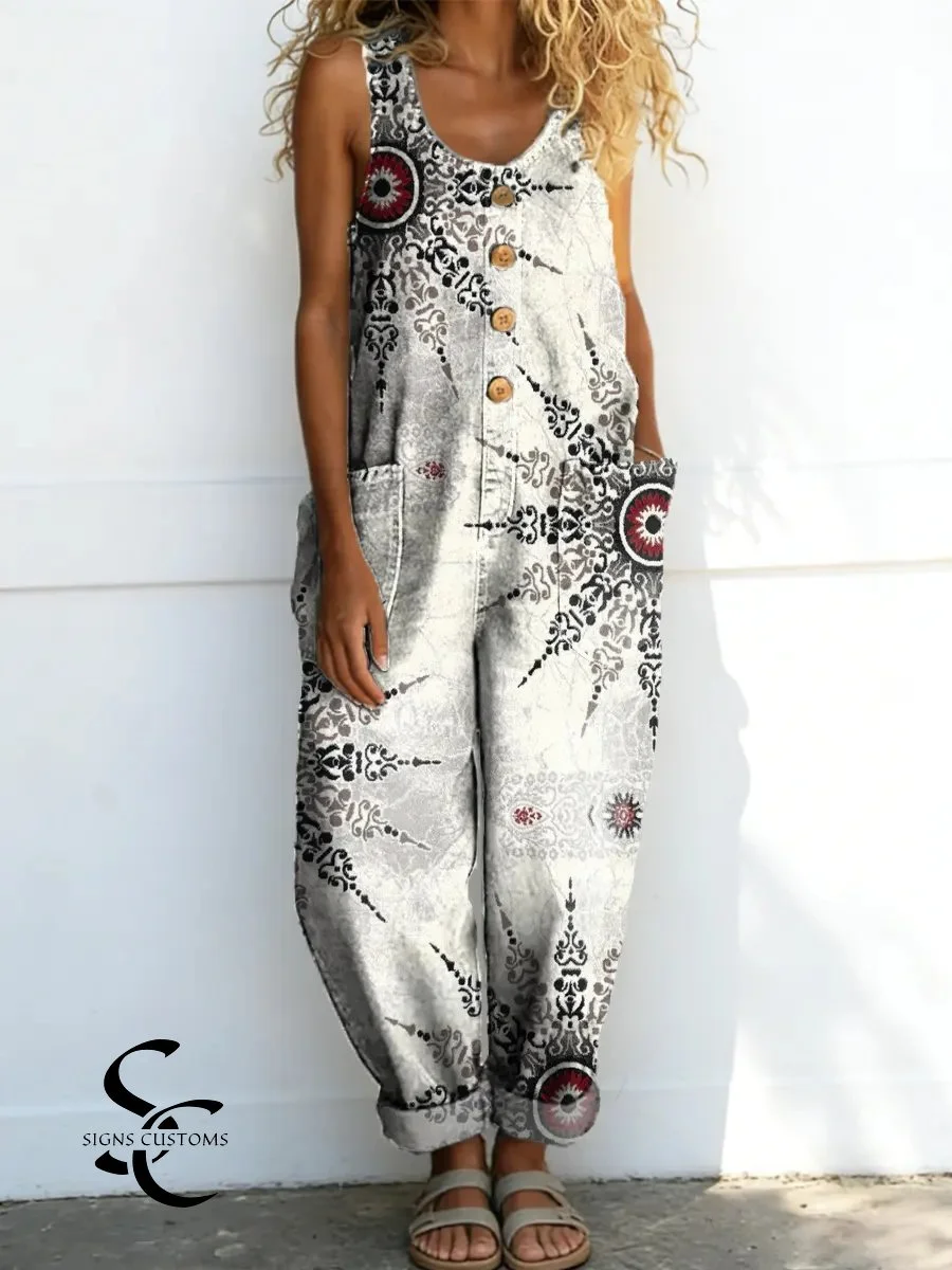 Women's Vintage Pattern Art Print Casual Cotton Denim Jumpsuit