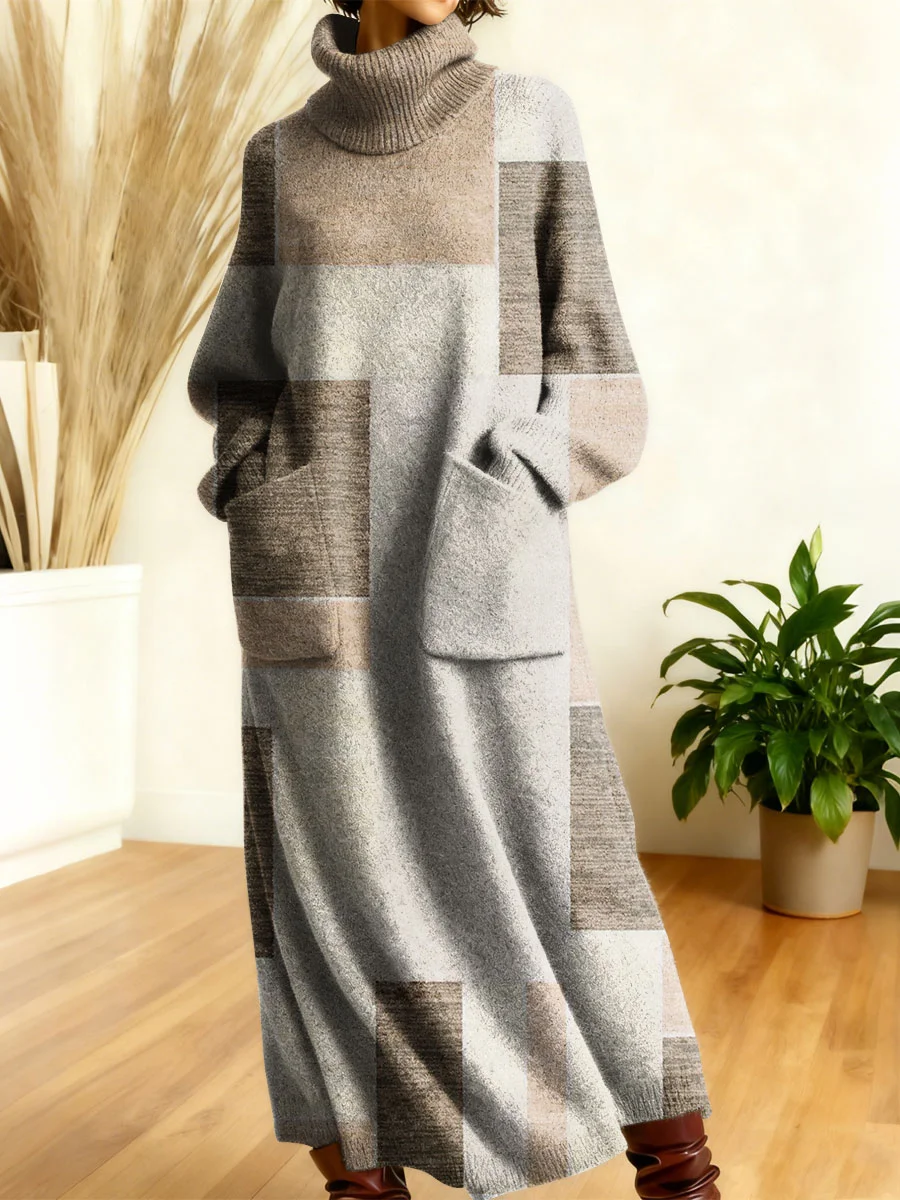 Women's Retro Geometric Patchwork High-neck Long-sleeve Casual Loose Knit Dress