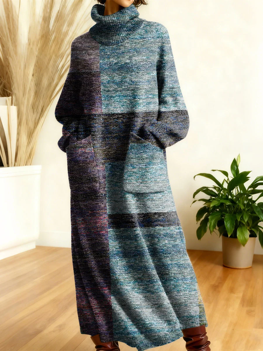 Women's Retro Geometric Patchwork High-neck Long-sleeve Casual Loose Knit Dress
