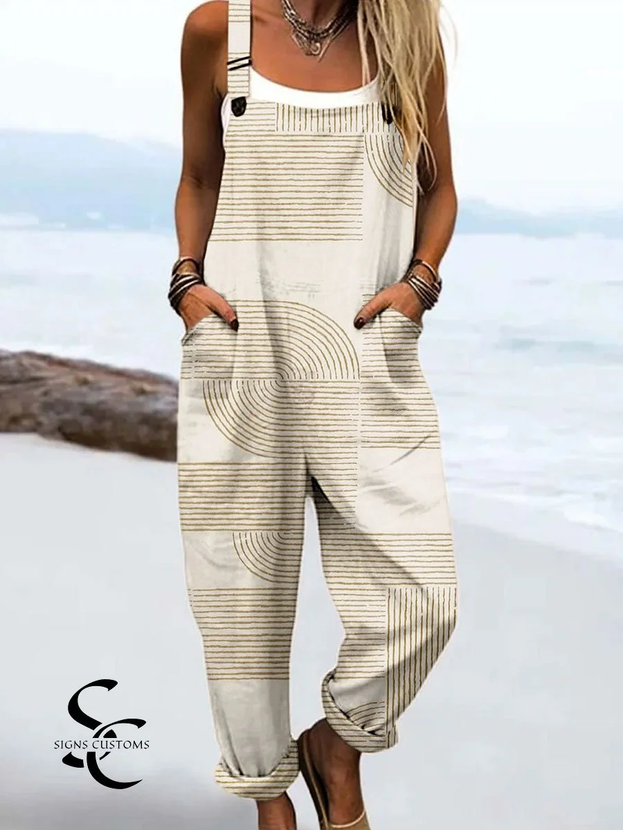 Women's Vintage Abstract Geometric Lines Print Casual 100% Cotton Wide Leg Jumpsuit