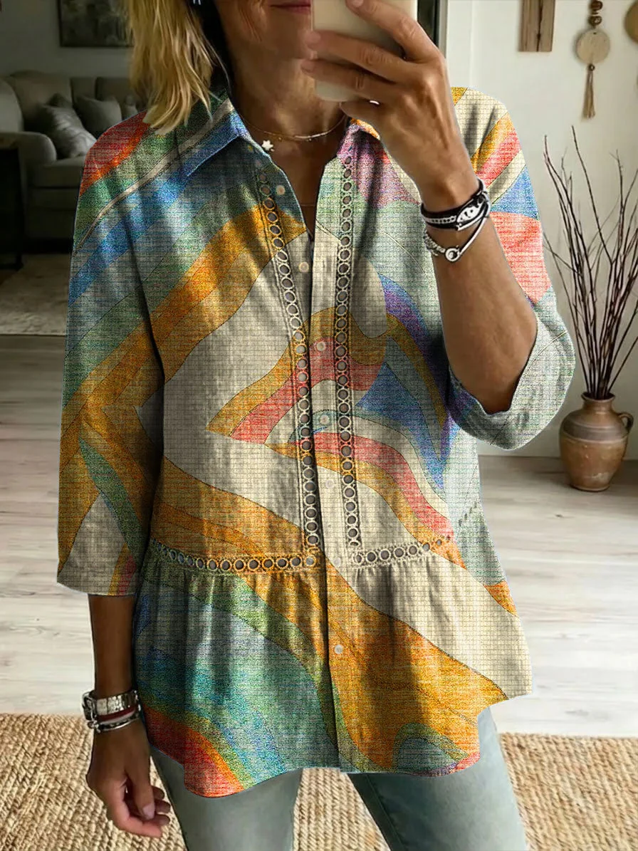 Floral Flowers Art Patterns Casual Patchwork Openwork Webbing Linen And Cotton Shirt