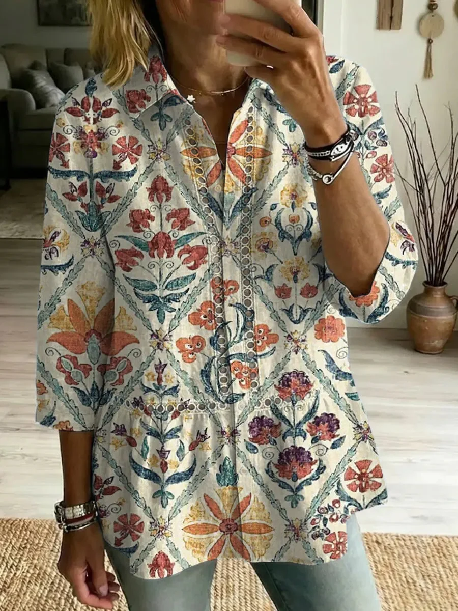 Women's Retro Floral Art Print Casual Lapel Cotton Shirt
