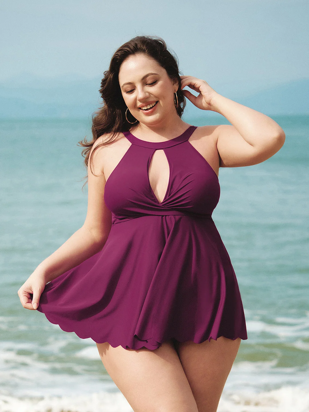 Burgundy Halter Twist Front Plus Size Tankini Top
