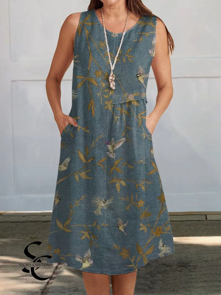 Women's Vintage Flowers Art Print Sleeveless Cotton Pocket Wrap Dress