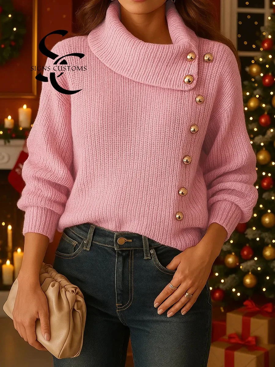 Women's Solid Color Collared Long-sleeved Casual Loose Knit Sweater