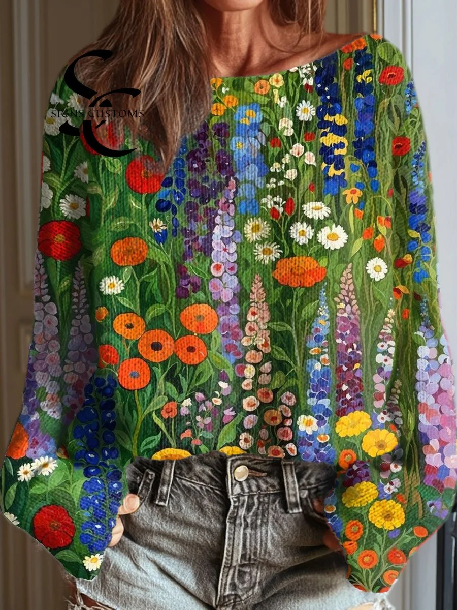 Women's Vintage Flower Art Print Casual Pullover Sweater