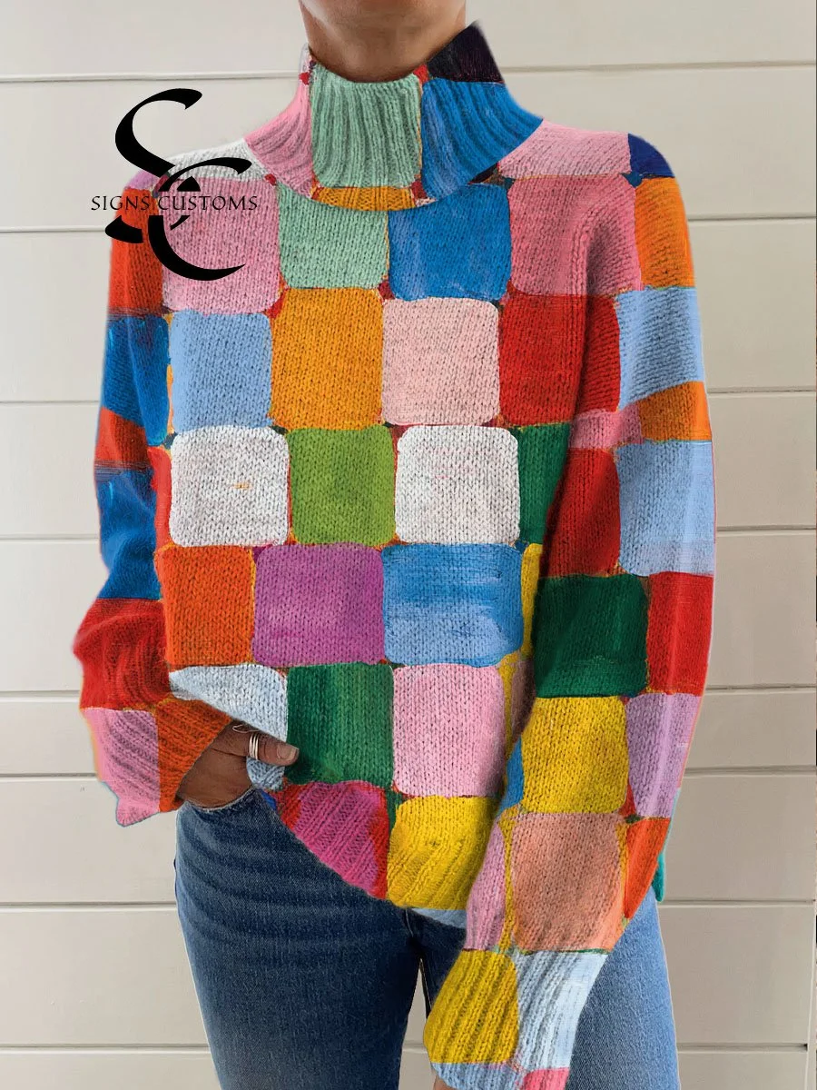 Women's Art Color Plaid Print Knit Turtleneck Pullover Sweater