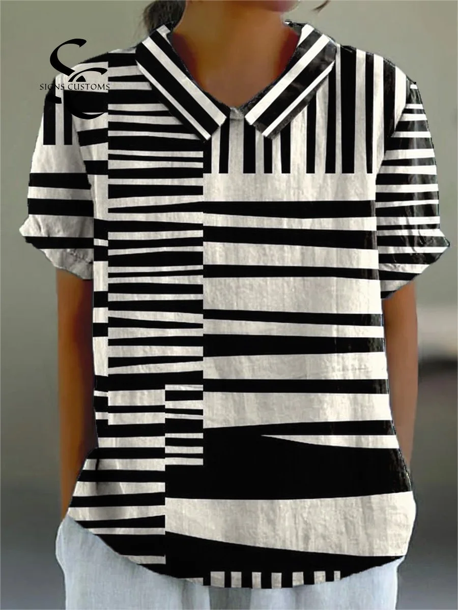 Abstract Strip Pattern Printed Women's Casual Cotton And Linen Shirt