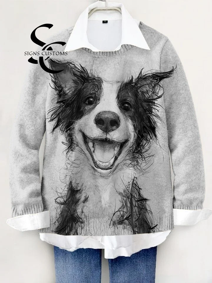 Hand-Painted Knit Pullover Sweater Featuring Adorable Dogs