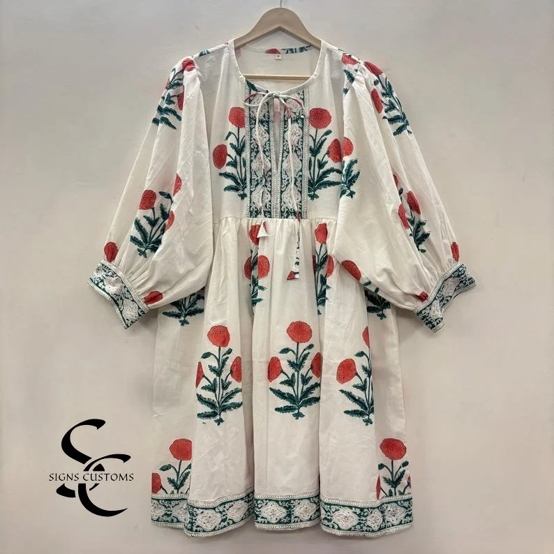 Crafted from 100% soft cotton with traditional hand block printing, this beautifully designed dress features a full lining for extra comfort and durability. Its breathable fabric and elegant style make it a perfect gift for your loved ones, ideal for both casual days and special occasions.