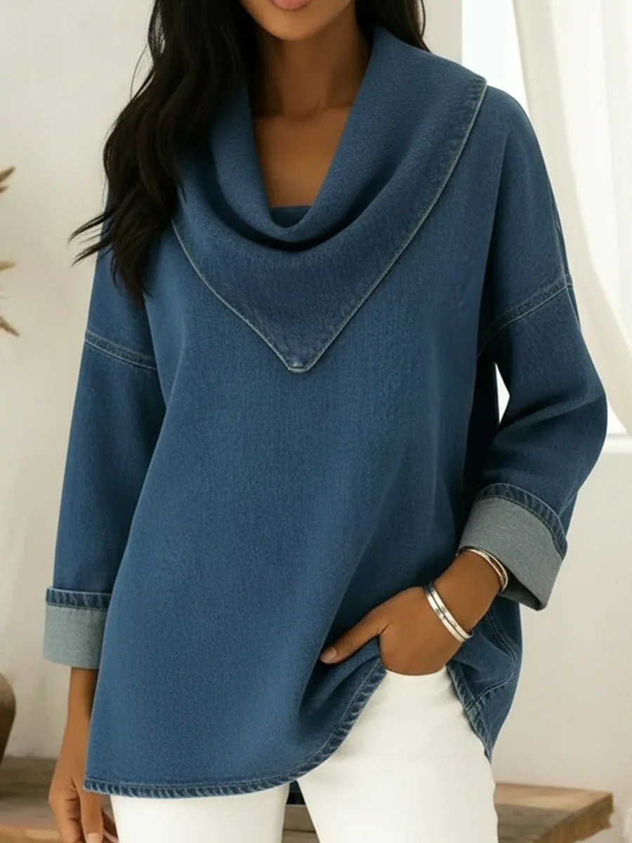 Retro Style Triangular Collar Loose-fitting Denim Cotton Top
