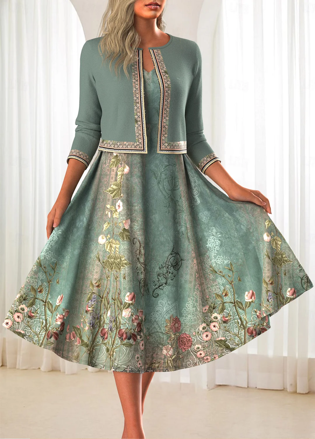 Sage Green Two Piece Floral Print Dress and Cardigan