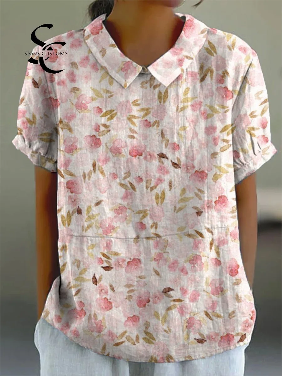 Vintage Art Flower Print Casual Cotton And Linen Shirt