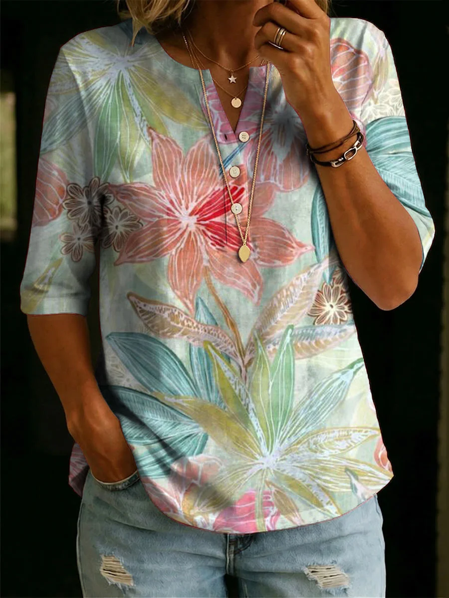 Women’s Floral Pattern Art Casual Classic Henley Collar 100% Cotton T-shirt