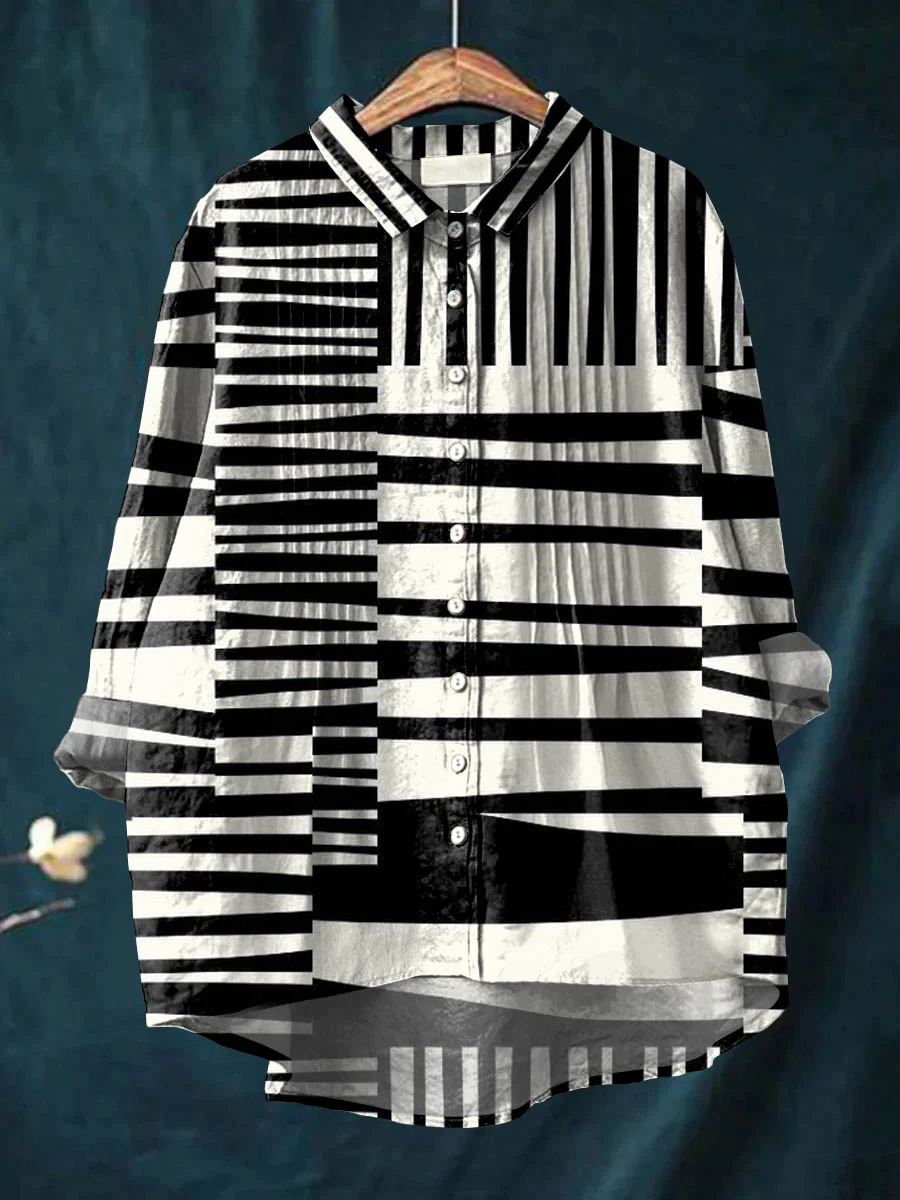 Women's Abstract Geometric Pattern Art Print Casual Cotton And Linen Ruffle Shirt