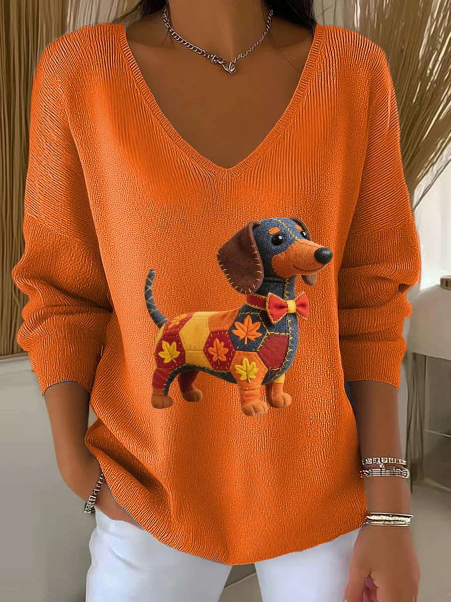Women's Autumn Dog Art Print V-Neck Ribbed Top