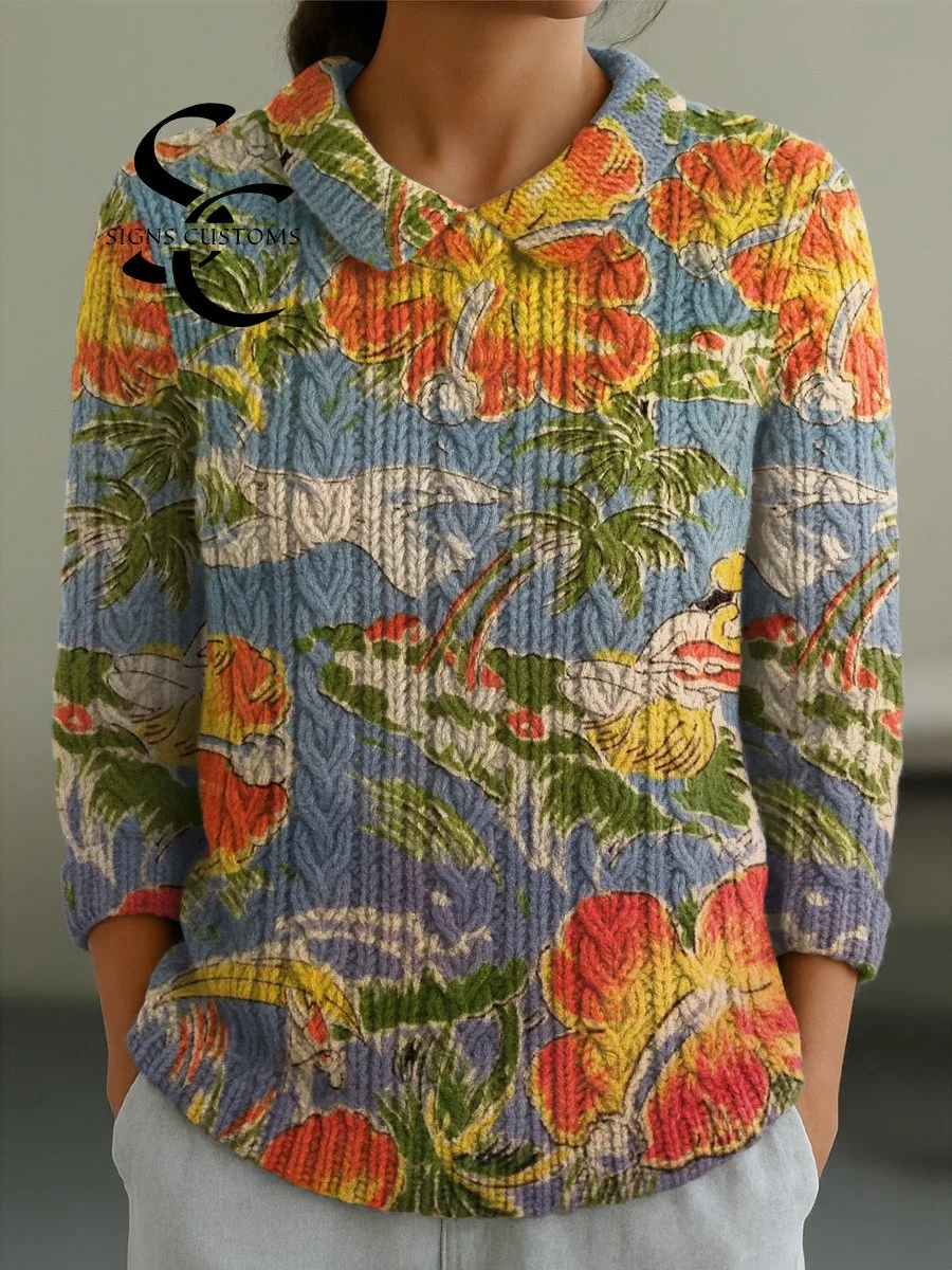 Women's Bird And Flowers Pattern Casual Peter Pan Collar 3/4 Sleeve Sweater