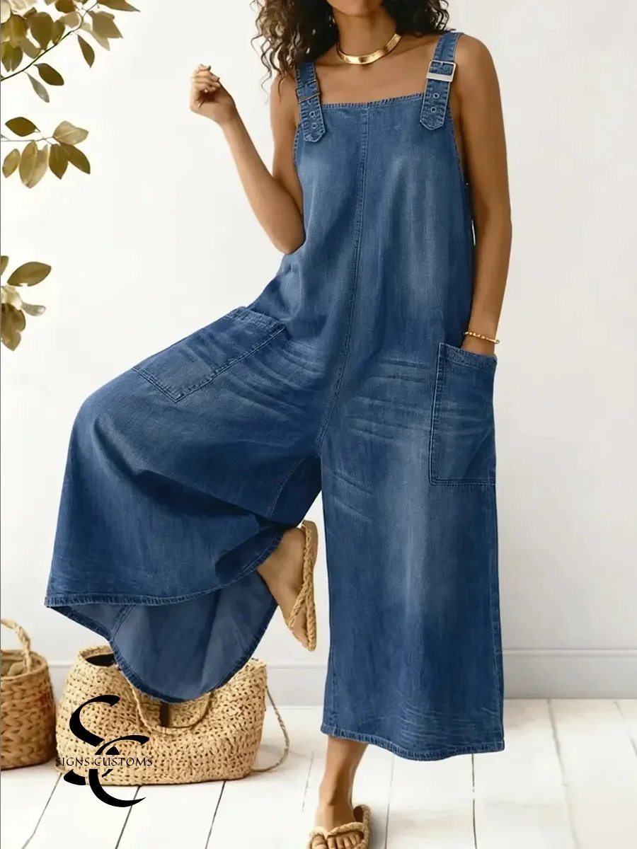 Women's Casual Denim Cotton Jumpsuit With Adjustable Straps
