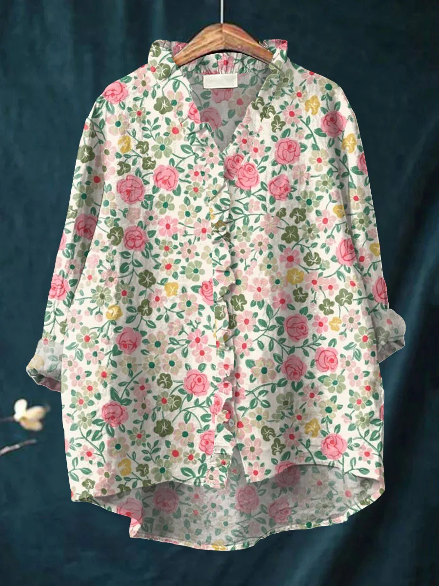 Women's Floral Art Print Casual Cotton And Linen Ruffle Shirt