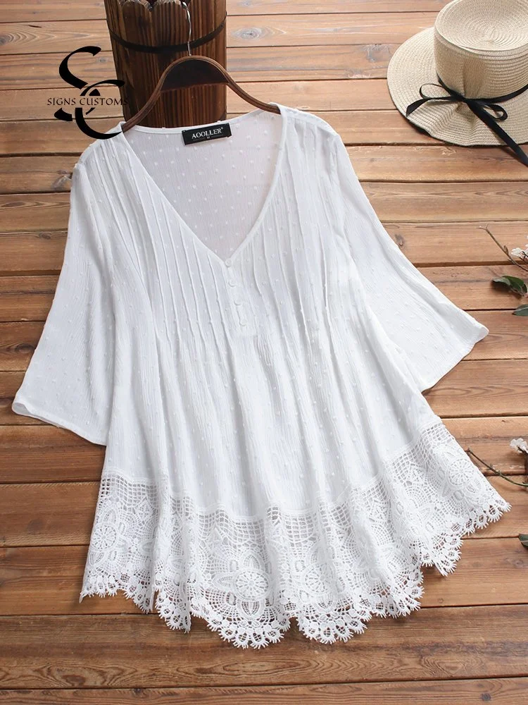 Women's Jacquard Pleated Lace Hollow V-neck Top