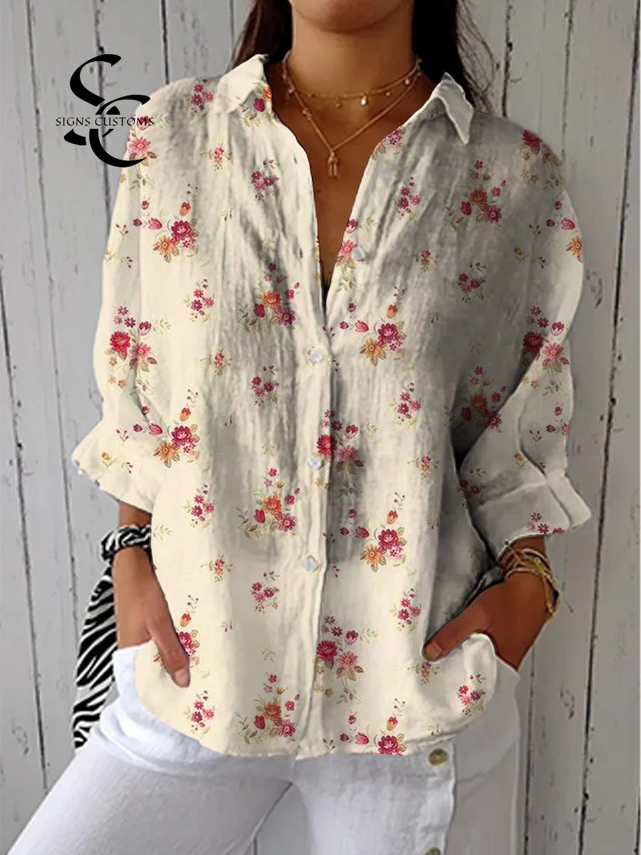 Women's Lovely Floral Art Print Casual Cotton Linen V-neck Shirt