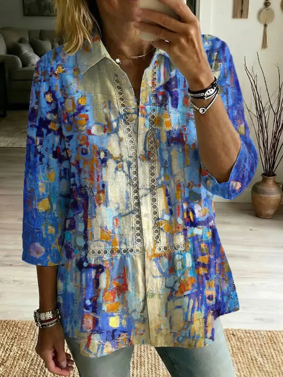 Women's Retro Art Print Casual Lapel Cotton Shirt