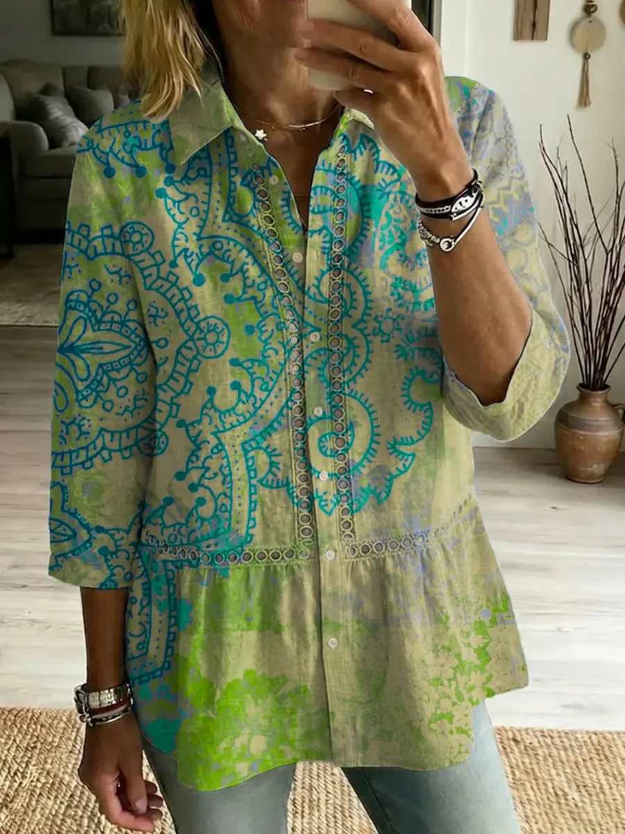 Women's Retro Floral Art Print Casual Lapel Cotton Shirt