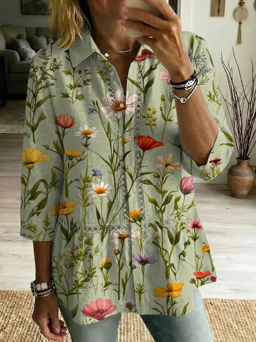 Women's Retro Floral Art Print Casual Lapel Cotton Shirt