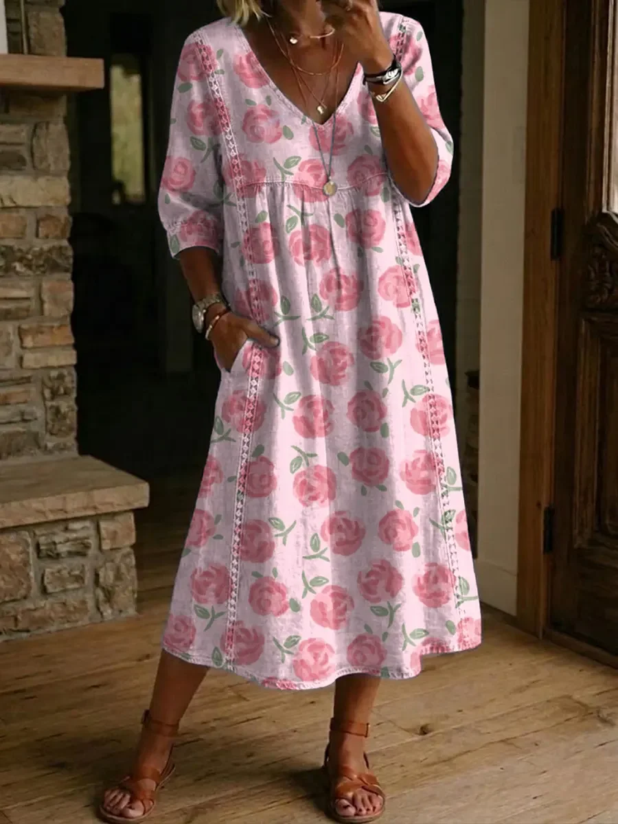 Women's Retro Flower Pattern Print Cotton-linen Dress