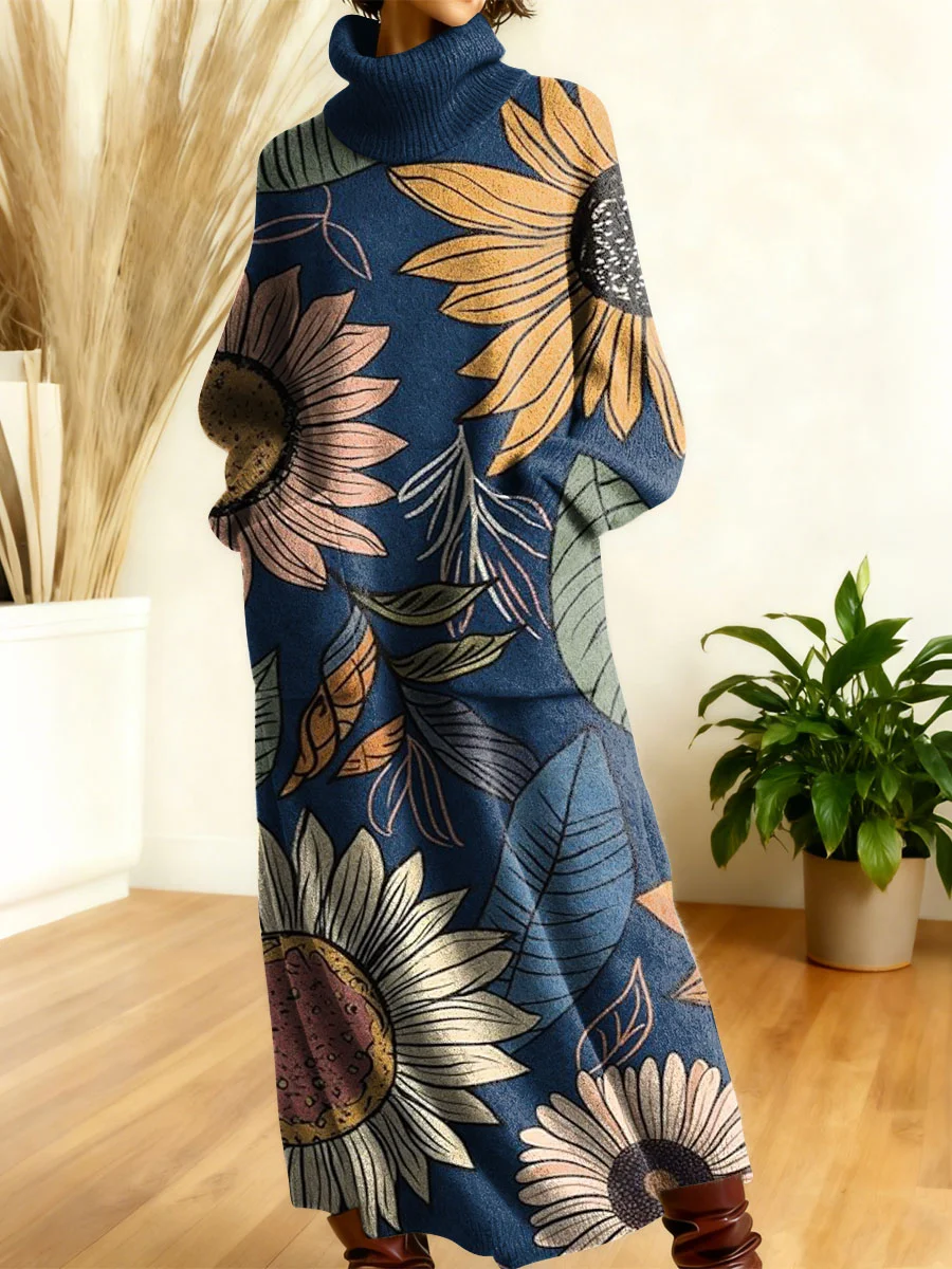 Women's Retro Flowers Geometric Patchwork High-neck Long-sleeve Casual Loose Knit Dress