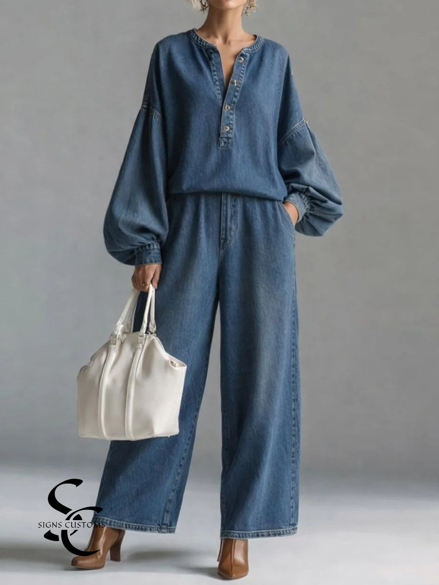 Women's V-neck Long-sleeved Casual Loose Denim Top And High-waisted Loose Wide-leg Denim Pants Set.