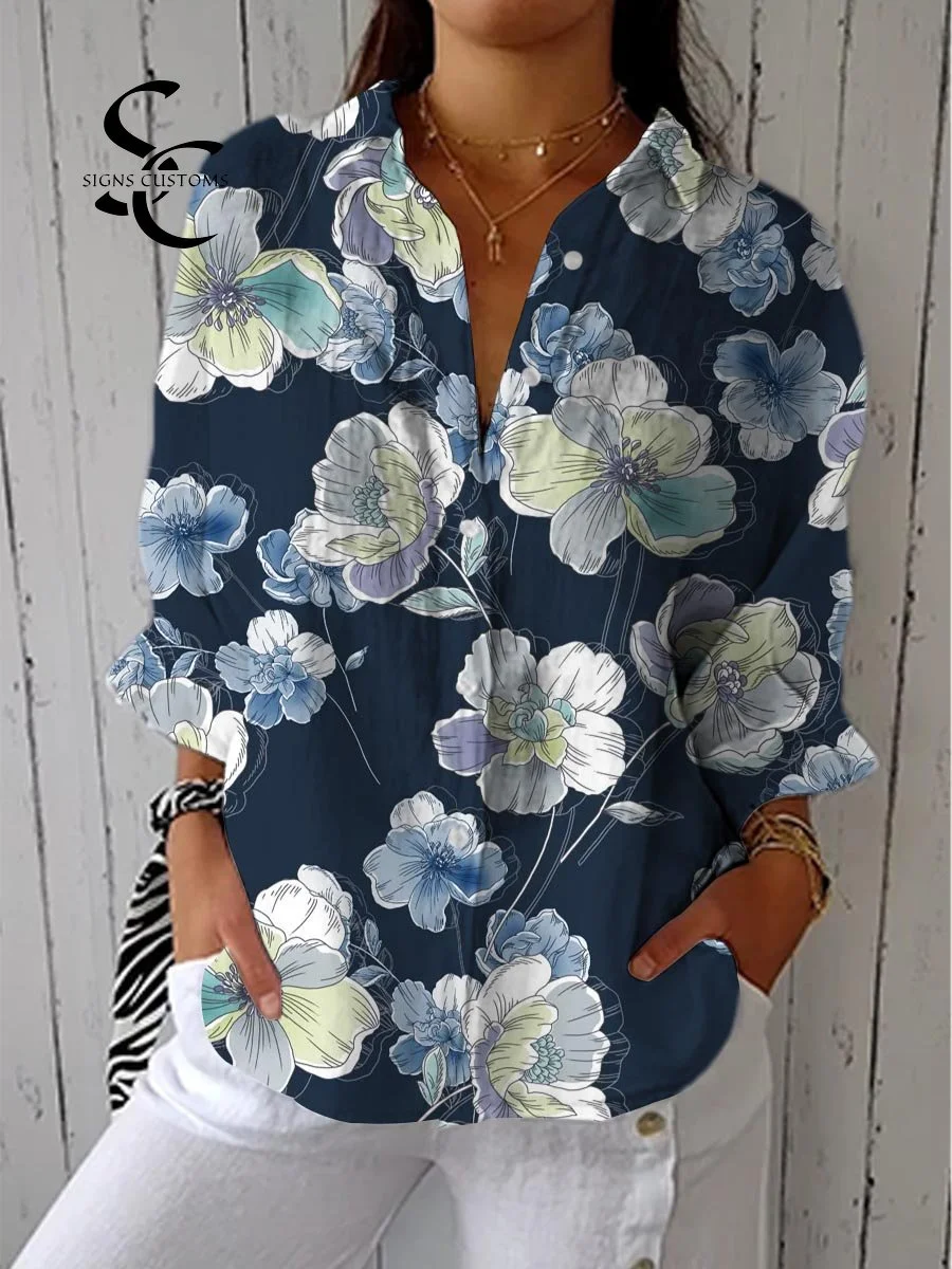 Women's Vintage Art Flower Print Casual Linen V-neck Shirt