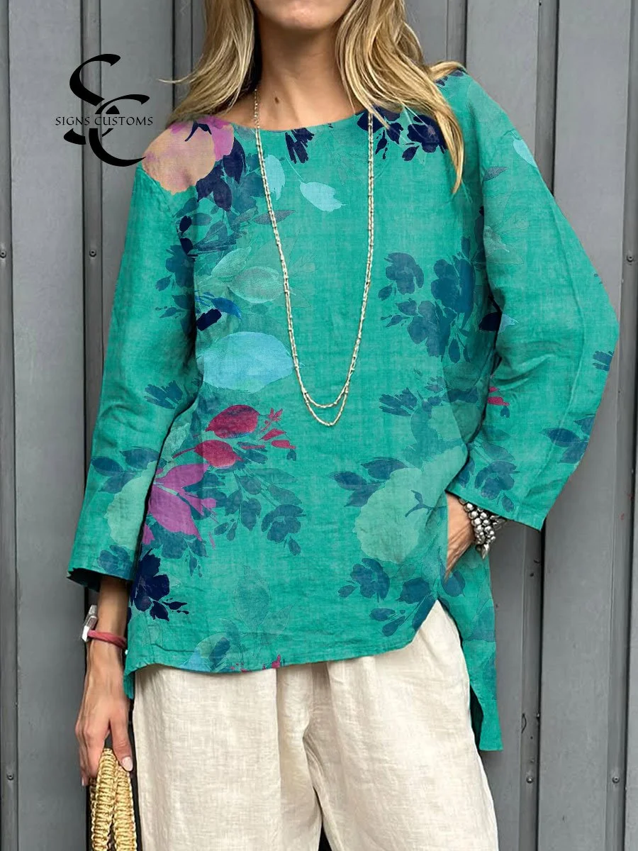 Women's Vintage Botanical Art Print Casual Cotton And Linen Shirt
