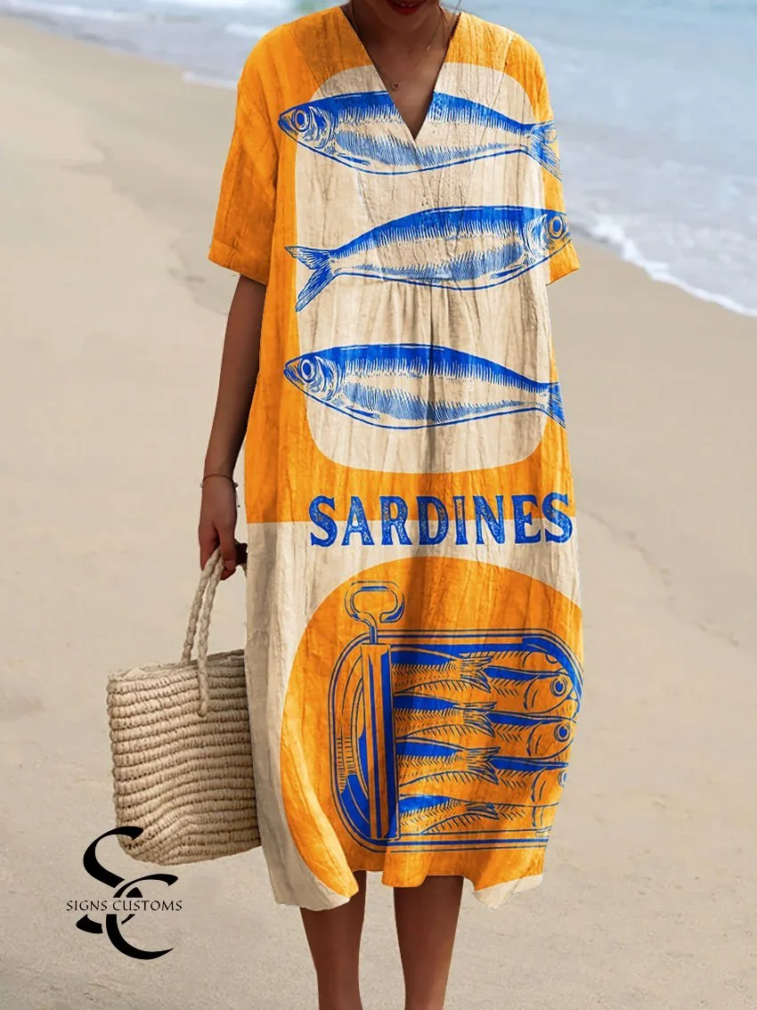 Women's Vintage Sardine Fish Art Print Flowy Dress