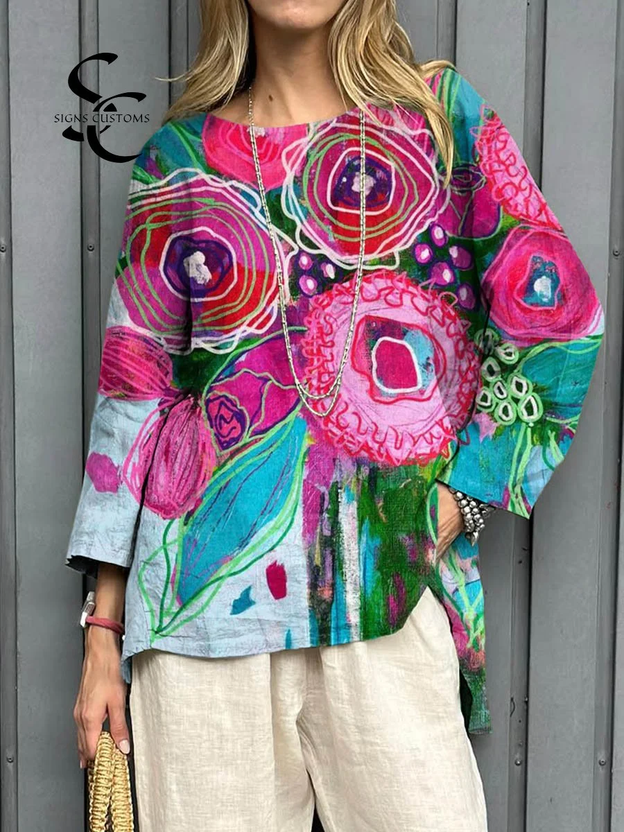 Women's Vintage Floral Art Print Casual Cotton And Linen Shirt