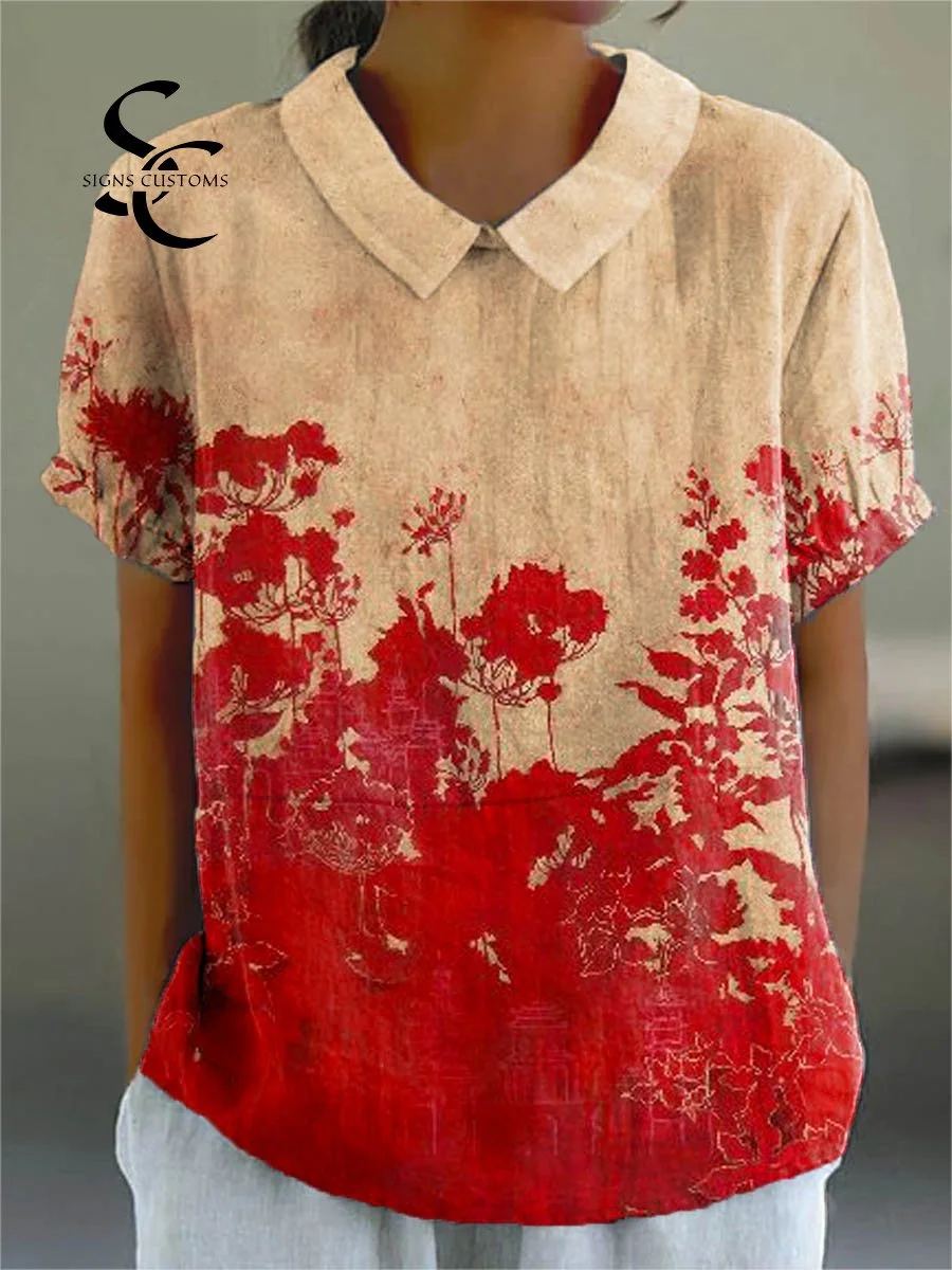 Women's Vintage Floral Art Print Casual Cotton And Linen Shirt