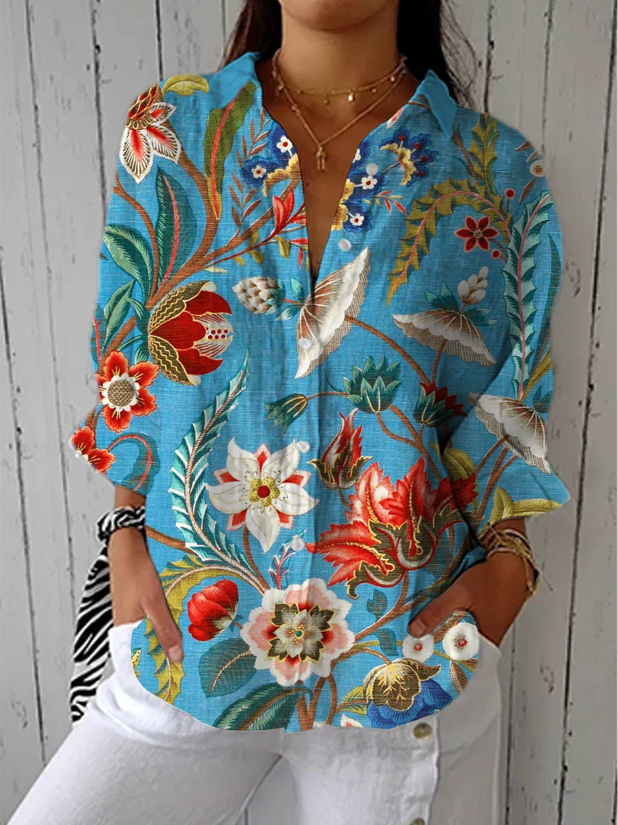 Women's Vintage Floral Art Print Casual Cotton Linen V-neck Shirt
