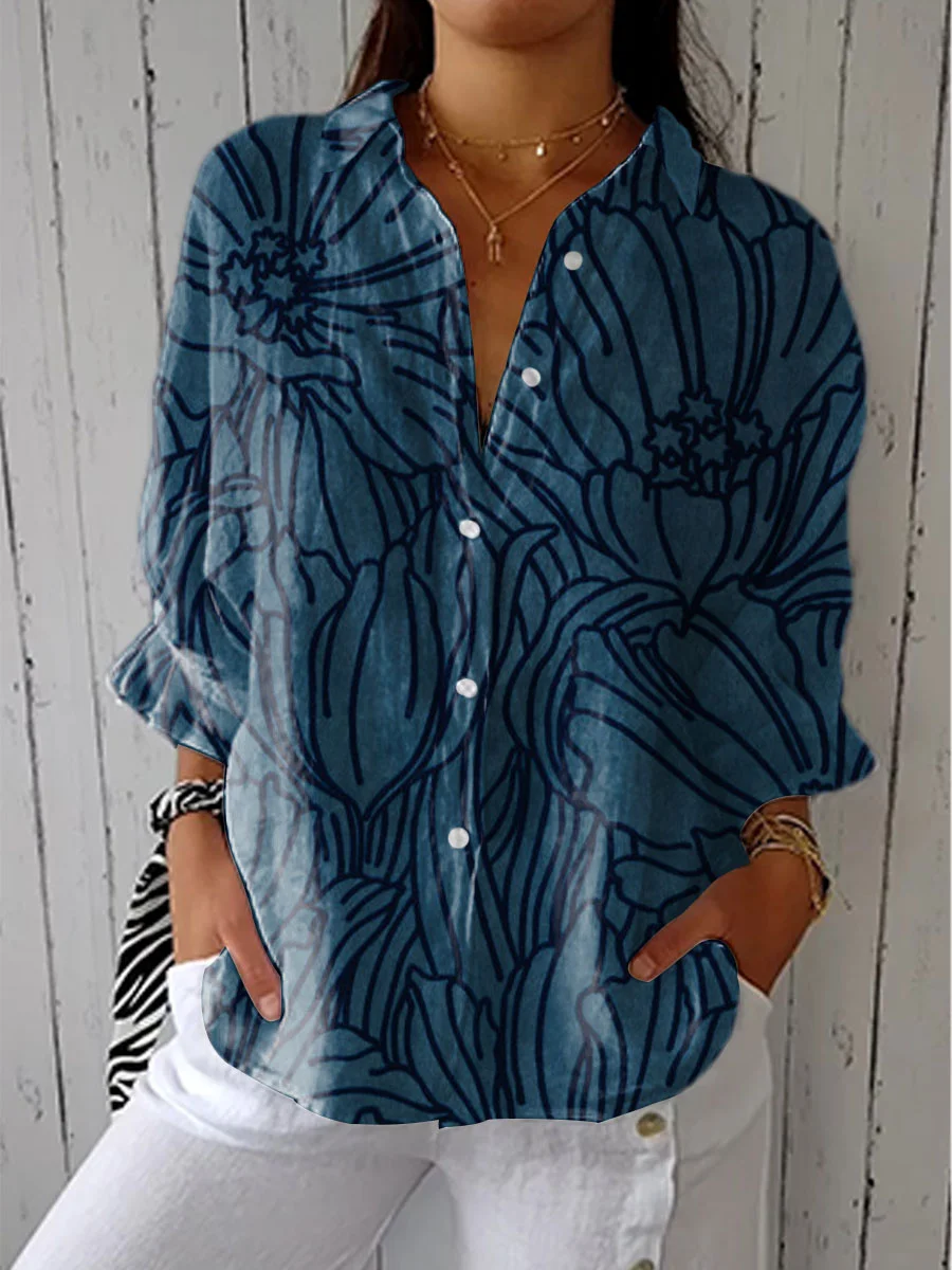 Women's Vintage Floral Art Print Casual Linen V-neck Shirt