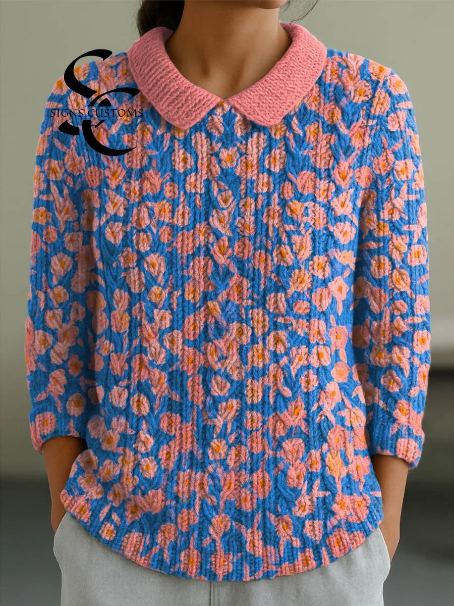 Women's Vintage Floral Art Print Casual Peter Pan Collar 3/4 Sleeve Sweater