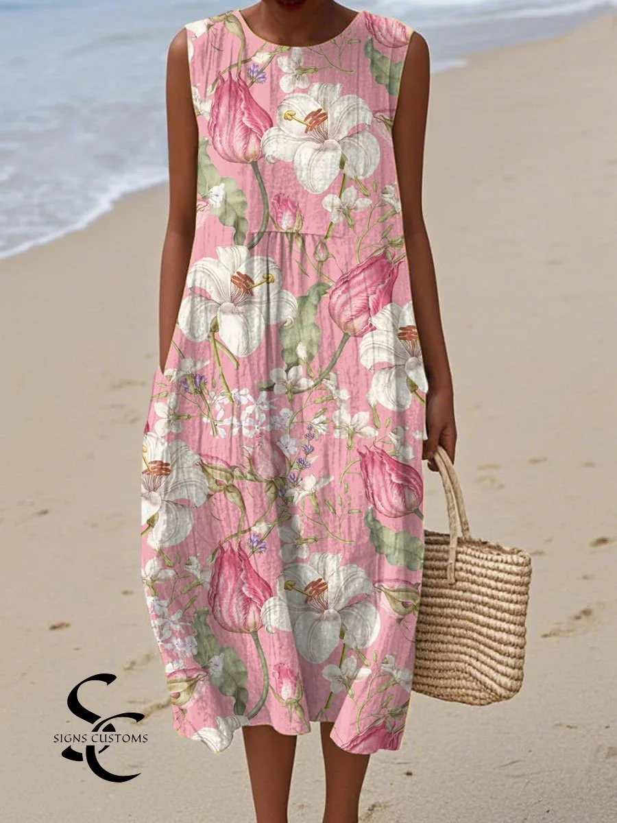 Women's Vintage Floral  Art Print Sleeveless Cotton Pocket Wrap Dress