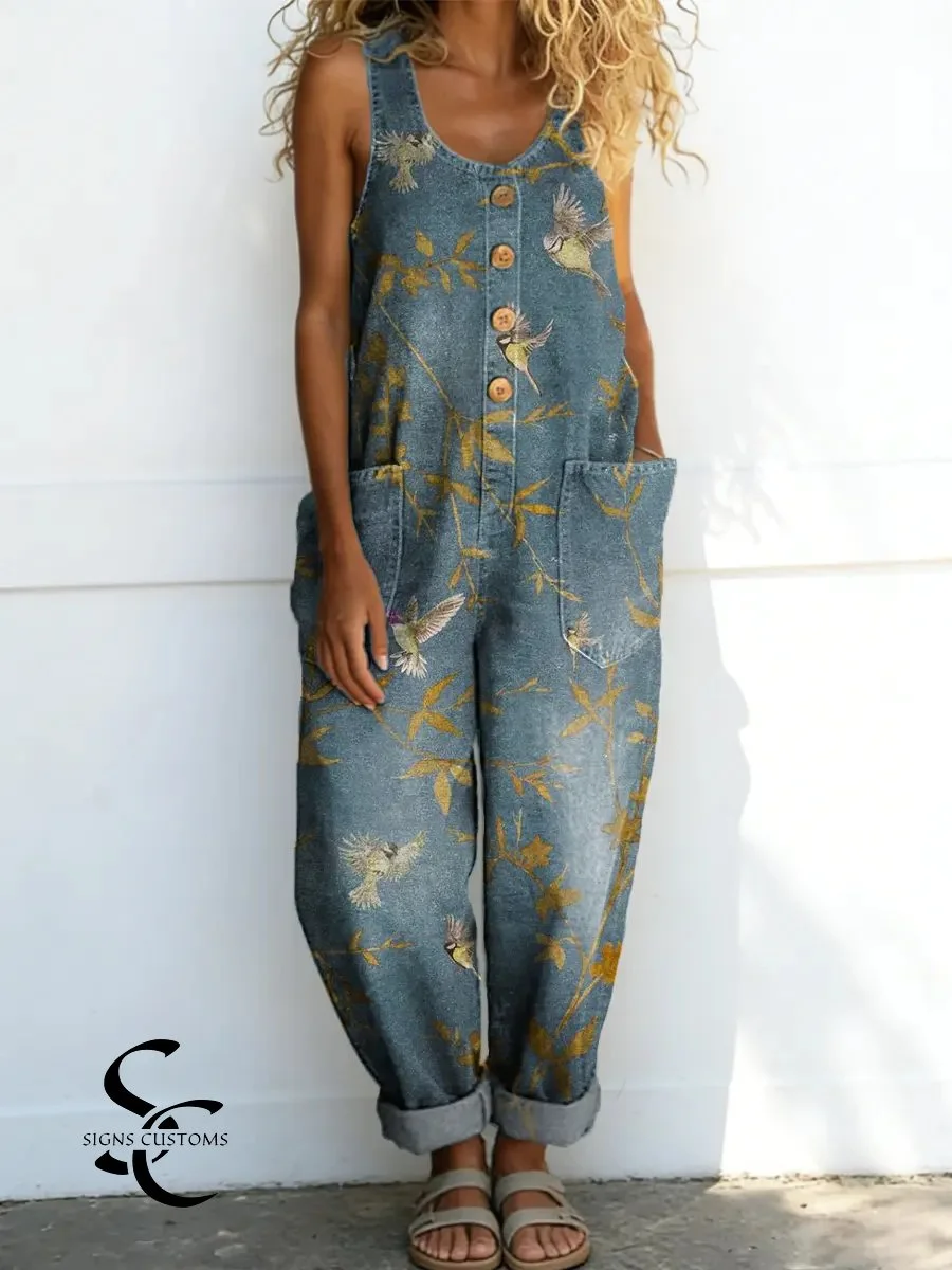 Women's Vintage Floral Birds Pattern Art Print Casual Cotton Denim Jumpsuit