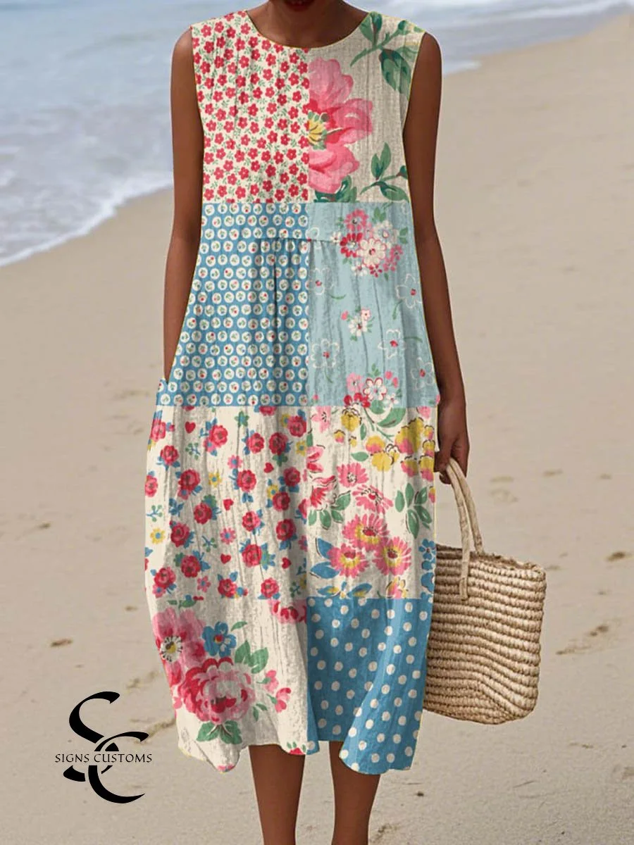 Women's Vintage Floral Pattern Art Print Sleeveless Cotton Pocket Wrap Dress